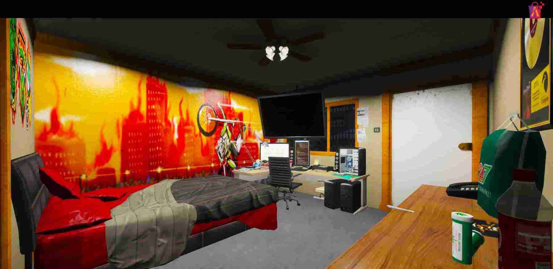 - Workstation areas featuring a chair, work table, and PC setup.